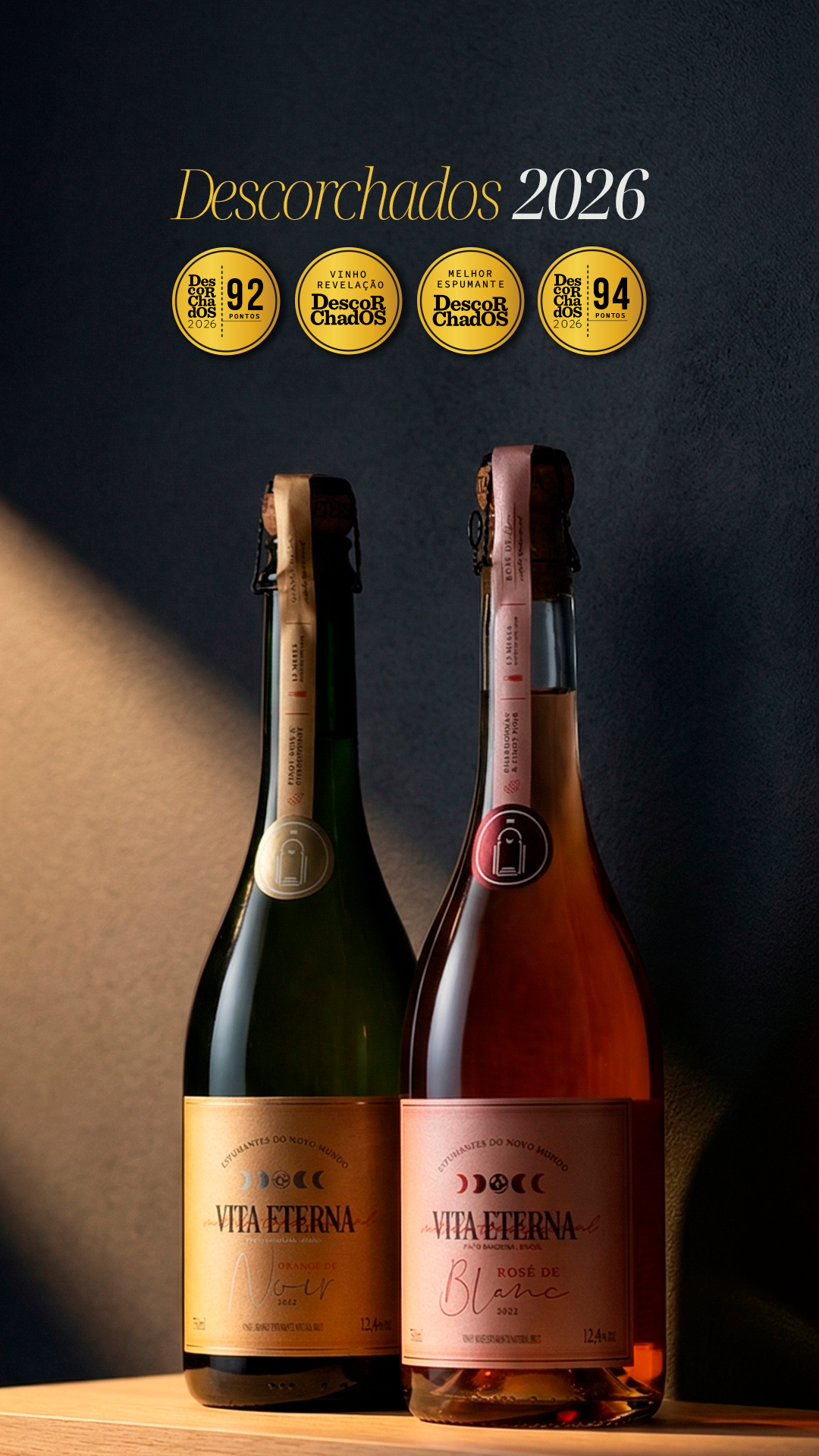 🍾 Espumante Rosé de Blanc (94 pontos): Uma expressão refinada e envolvente, com perlage fina, frescor vibrante e notas surpreendentes que encantam a cada gole.
